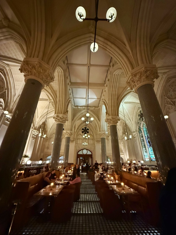 曾经的证券交易大厅现在变成了氛围感拉满的法餐fine dinning,旁边要么是小网红闪光灯咔咔咔要么是浮夸小香风白妹吊老钱风帅哥,搞的我差点都没法专注讲解币圈硬核干货了🫣