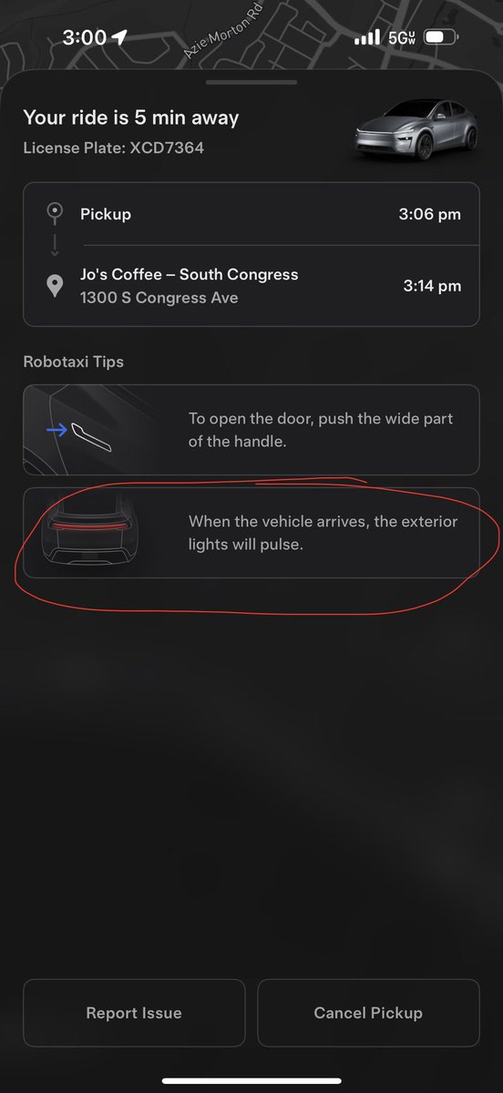 Taking my second Tesla Robotaxi ride… noticed when Robotaxi arrives the exterior lights will pulse to make it easier to find the car.