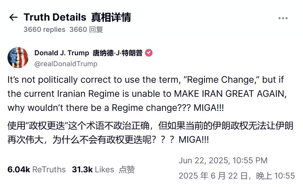 6月22日下午,特朗普在真相社交平台上发推,呼吁伊朗进行政权更迭,“让伊朗再次伟大!(MIGA)”。与此同时,有伊朗民众开始散布数字传单,呼吁安全部队倒戈推翻政权。