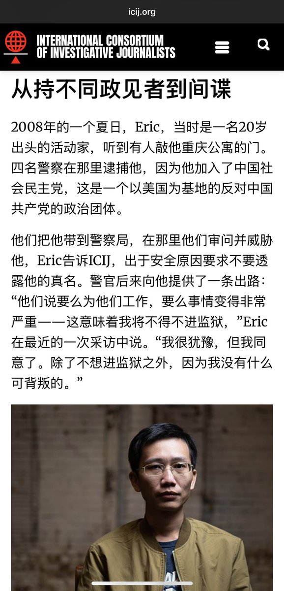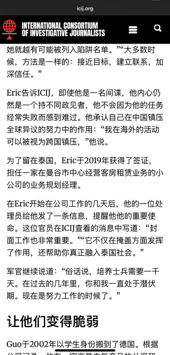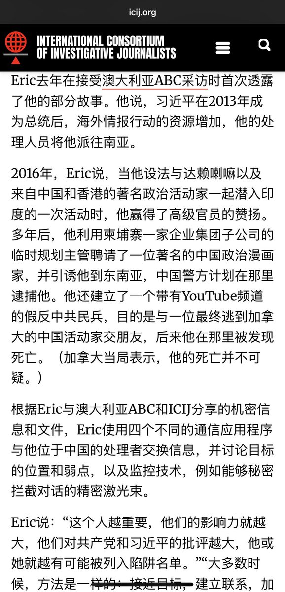 ICIJ(国际调查记者联盟)又发了篇专题报道,概述了几个人的秘密工作。我是其中唯一一个未被逮捕的,叛逃者。右上角有网页翻译,不太准确,主席翻成总统,官员翻成军官,截了几张凑合看吧。关于华涌,透露个事:虽然加政府曾称其死因不可疑,但我提供材料后,调查仍在继续,此案目前并无结论。