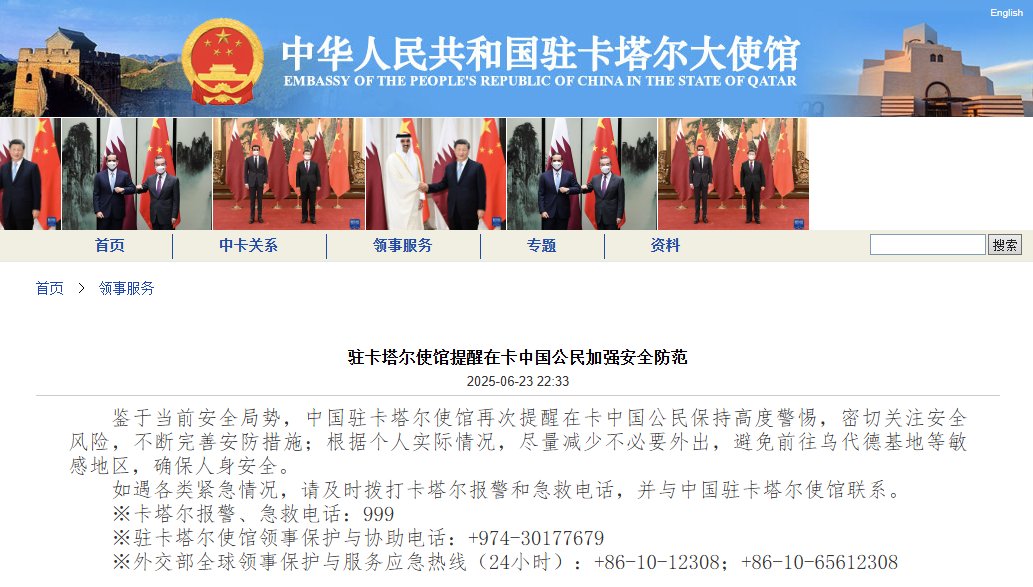 中国驻卡塔尔大使馆敦促在卡塔尔的中国公民避开乌代德空军基地,尽量减少不必要外出。