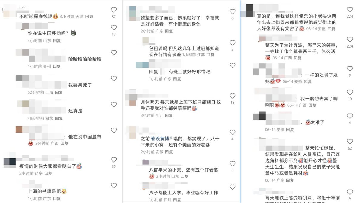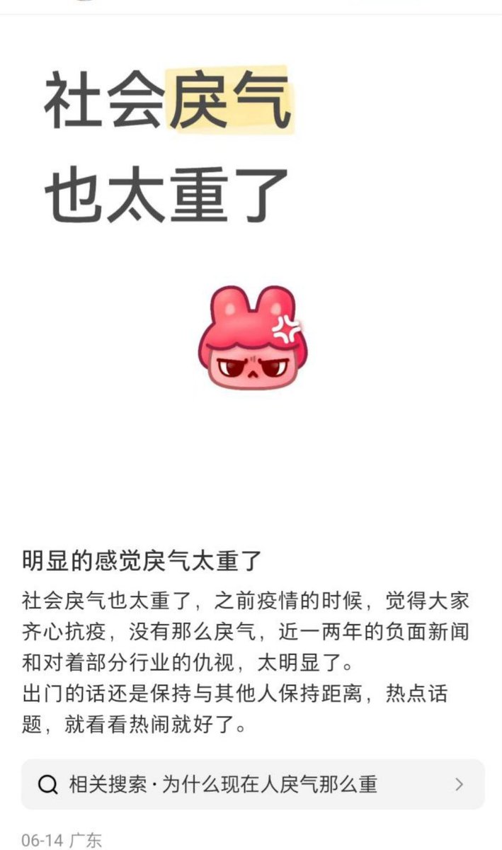 6月14日,广东,有博主发贴称:明显的感觉戾气太重了,社会庆气也太重了,之前疫情的时候,觉得大家齐心抗疫,没有那么戾气,近一两年的负面新闻和对着部分行业的仇视,太明显了。出门的话还是保持与其他人保持距离,热点话题,就看看热闹就好了。结果网友评论道:“疫情的时候大家都看明白了”