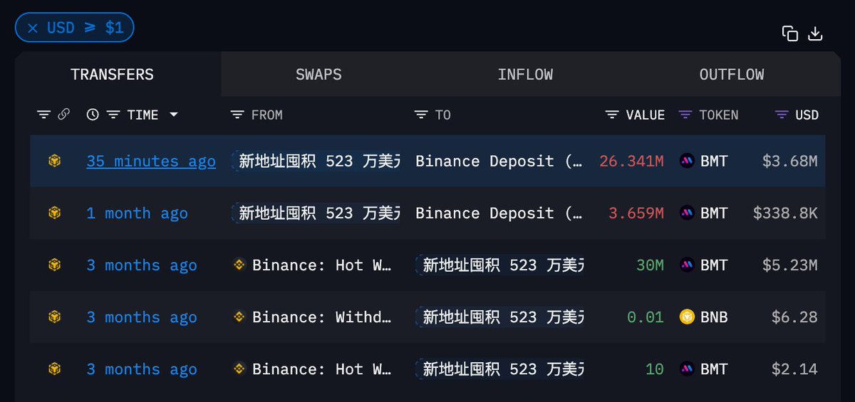 三个月前囤积 3000 万枚 $BMT 的新地址,半小时前已将剩余 2634 万枚充值进 #Binance,价值 368 万美元2025.03.22 提出时币价 $0.1743,本次若卖出将亏损 91.4 万美元(充值价格 $0.1396)📉至此该地址的代币已完成清仓钱包地址
