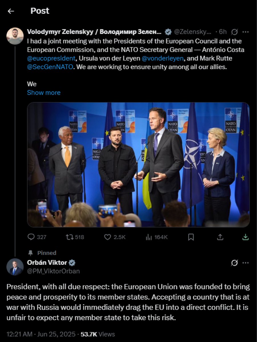 匈牙利总理欧尔班对泽连斯基喊话:总统先生,恕我直言:欧盟成立的初衷是为成员国带来和平与繁荣。接纳一个与俄罗斯交战的国家,会立即将欧盟拖入直接冲突。期望任何成员国承担这种风险都是不公平的。