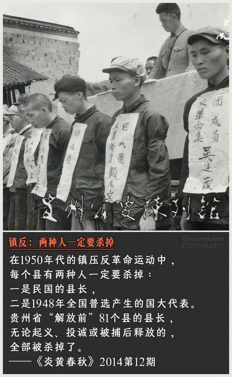 在1950年代的镇压反革命运动中,每个县有两种人一定要杀掉:一是民国的县长,二是1948年全国普选产生的国大代表。贵州省“解放前”81个县的县长,无论起义、投诚或被捕后释放的,全部被杀掉了。——《炎黄春秋》2014第12期🔥更多好图👉