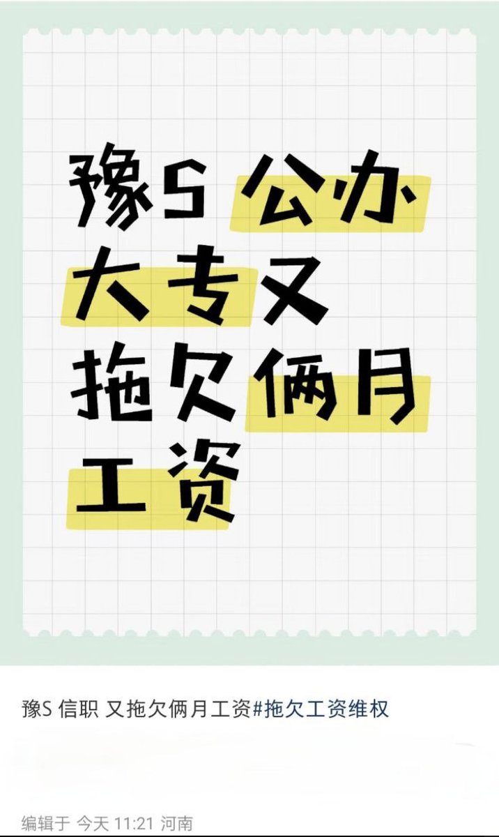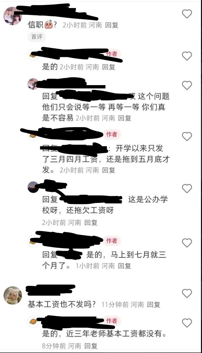 河南信阳,信阳职业技术学院公办大专拖欠俩月工资。博主表示:开学以来只发了三月四月工资,还是拖到五月底才发。马上到七月就拖欠三个月了,近两三年一直没进统发,老教师工资也才两三千。6月26日,一博主吐槽,山东济南长清区非编教师工资,拖欠3个月。多名网友评论:他们工资都被拖欠快一年了。