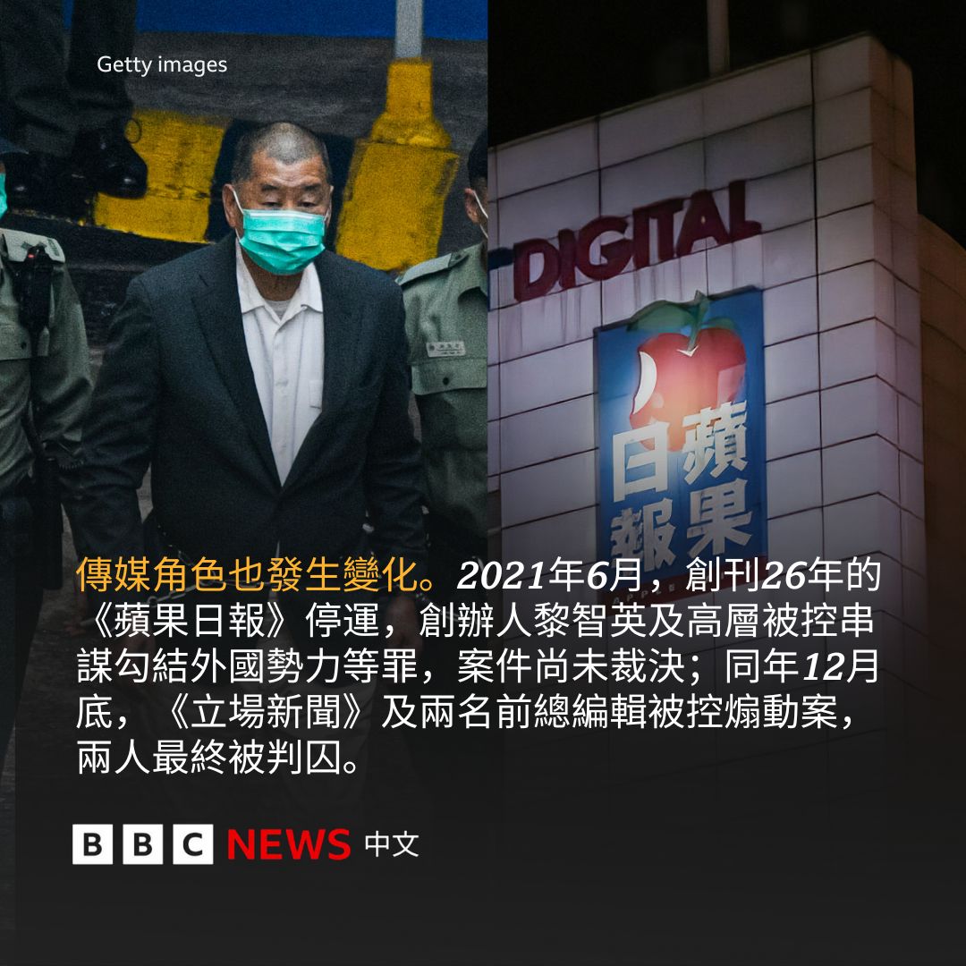 媒体角色也随之转变。2021年6月,创刊26年的《苹果日报》停刊,创办人黎智英及多名高层被控串谋勾结外国势力等罪名,案件至今尚未裁决。同年12月底,《立场新闻》及两名前总编辑被控煽动案,两人最终被判囚。