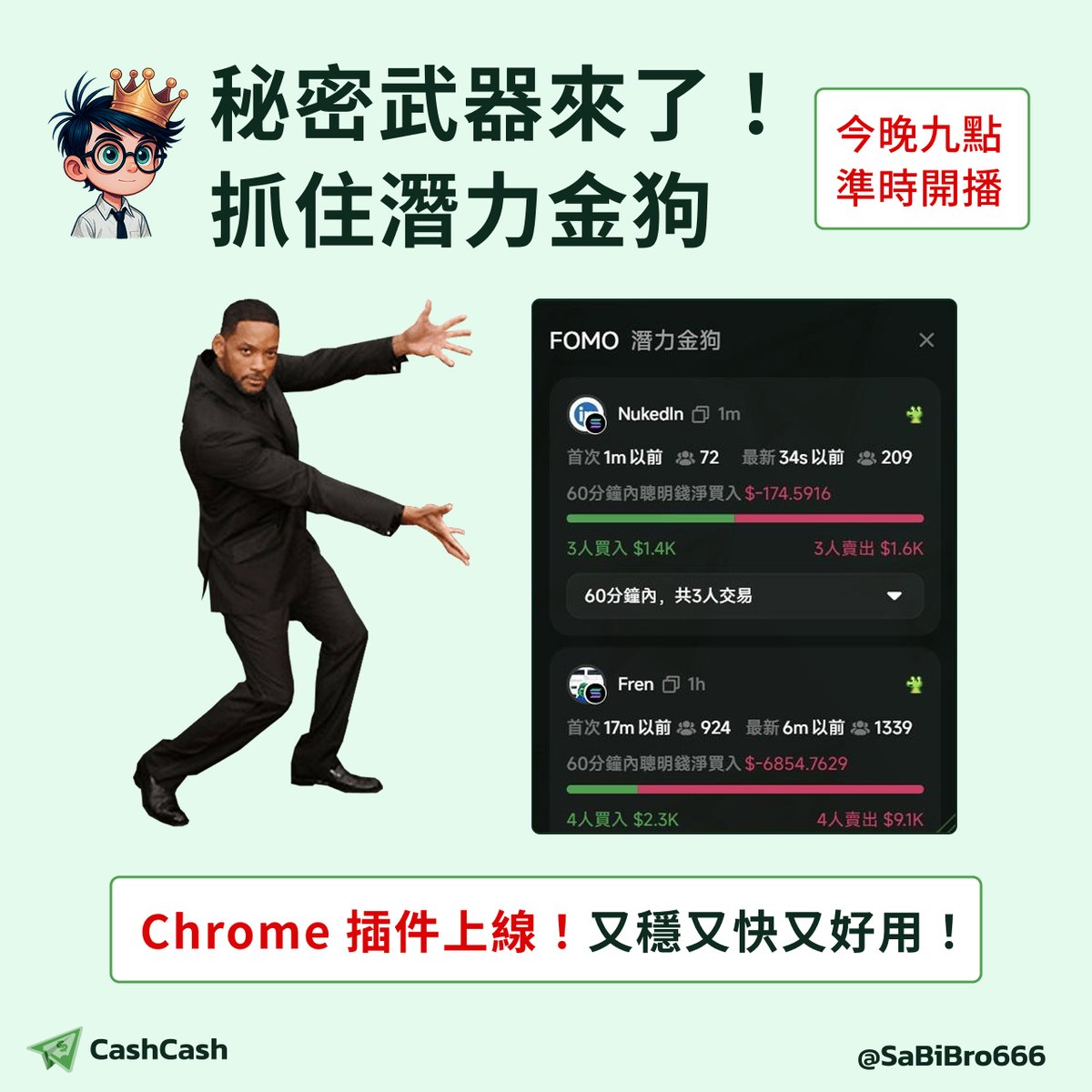 有什麼好用的鏈上工具?CashCash Chrome 插件已經上線啦!除了又快又穩的交易功能還有獨家金狗訊號!幫你抓住市場熱點,不怕錯過🤩今天晚上九點 準時開播!想知道插件怎麼用趕快到直播間報到,還有紅包可以抽🤲