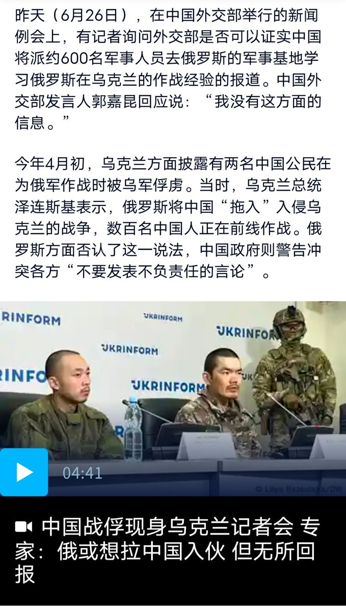乌克兰媒体援引知情人士称,俄罗斯武装部队基地今年将接待数百名中国军人,这些中方人员将学习借鉴俄在对乌作战中的经验。与此同时,俄方指责乌克兰的无人机导致中国记者卢宇光受伤。