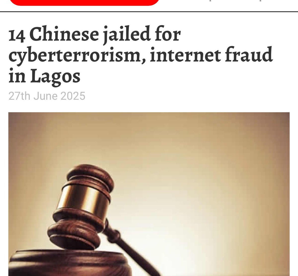 尼日利亚判处14名中国公民网恐怖主义罪名尼日利亚拉各斯联邦高级法院判处14名中国公民各一年的监禁,罪名是网恐怖主义和互联网诈骗。