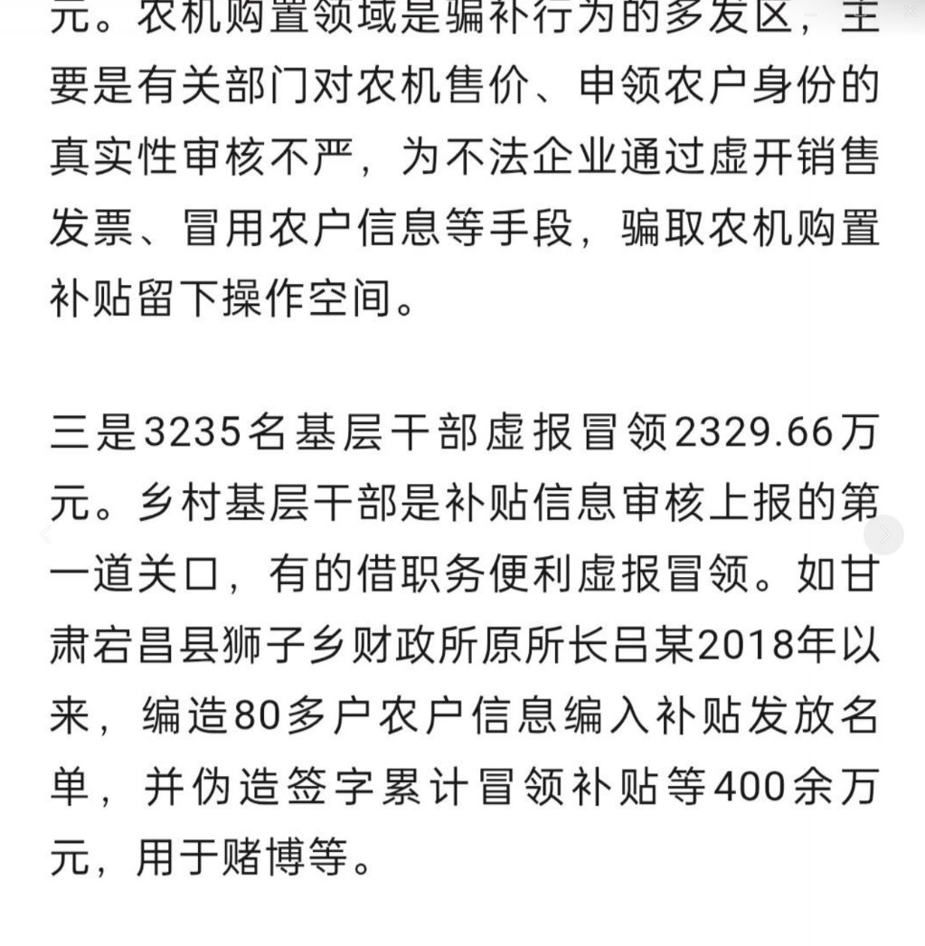 “惠农补贴变惠官补贴” 6月28日,财新报道。根据国务院2024年财政审计报告显示,全国16省175县存在截留挪用惠农补贴41亿余元,用于偿还当地政府债务,发放公职人员工资的情况。 另有104县的企业利用有关部门漏洞恶意骗取4.78亿元农机补贴款。 有3235名基层干部利用职务之便,冒领2329.66万元补贴款。 而因此被拖欠补贴的农民最长被拖欠达九年。