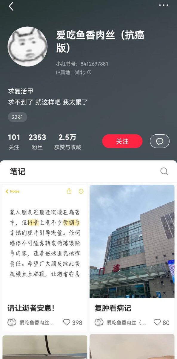 近日 抗癌博主“爱吃鱼香肉丝”去世,24年她大学毕业两个月确诊肠癌晚期,那时她才22岁。她曾因复试差一名考研失败,自责数月,因为找不到工作,感觉对不起爸妈,怕成为家里的拖累。她小红书最后的签名:“求复活甲!求不到了 就这样吧 我太累了”