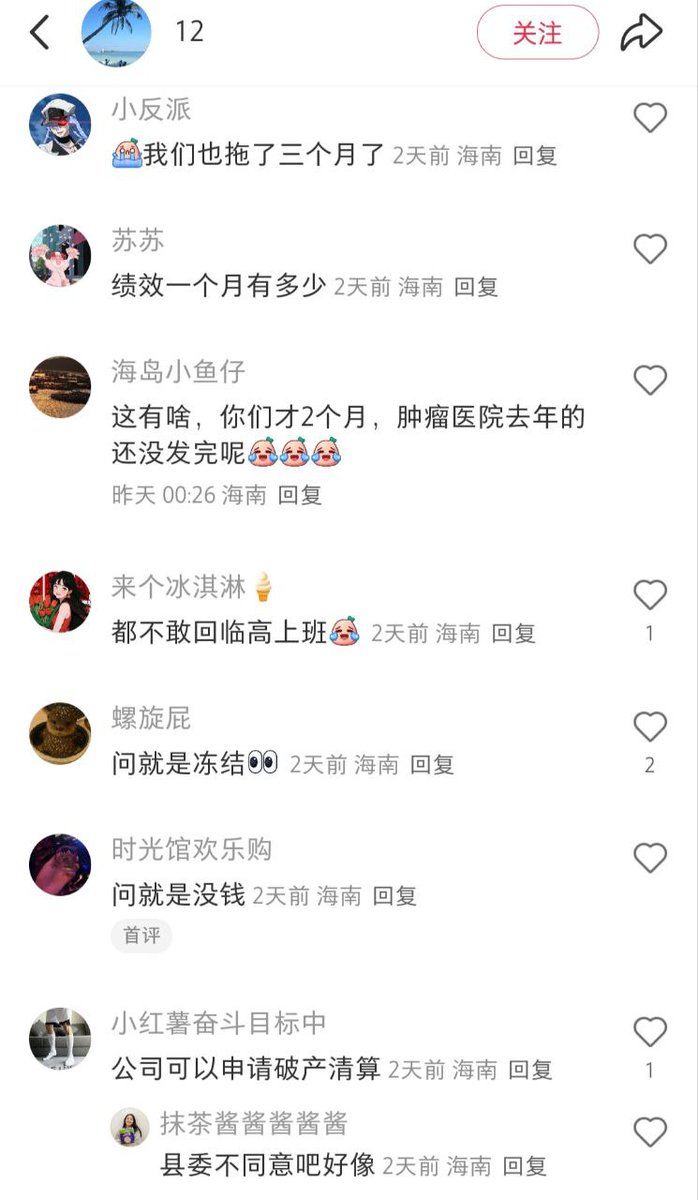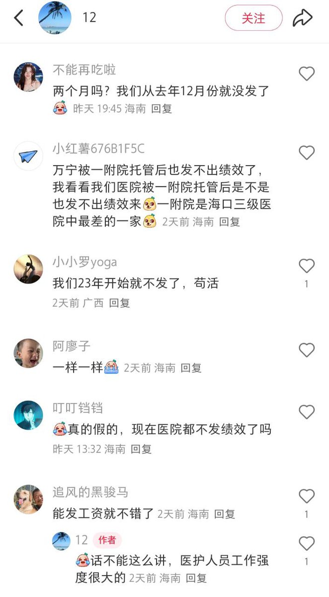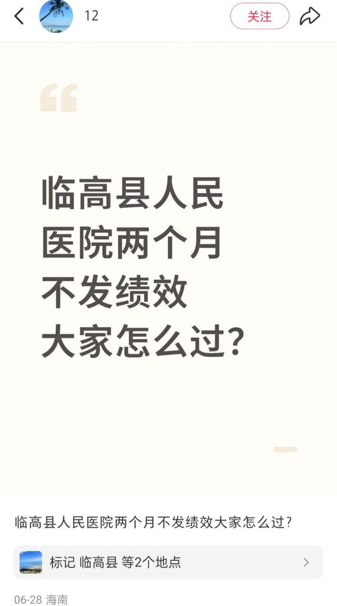 6月28日,海南,博主吐槽:临高县人民医院两个月不发绩效大家怎么过?网友们纷纷吐槽:IP海南:两个月吗?我们从去年12月份就没发了。IP广西:我们23年开始就不发了,苟活。IP海南:我们也拖了三个月了。