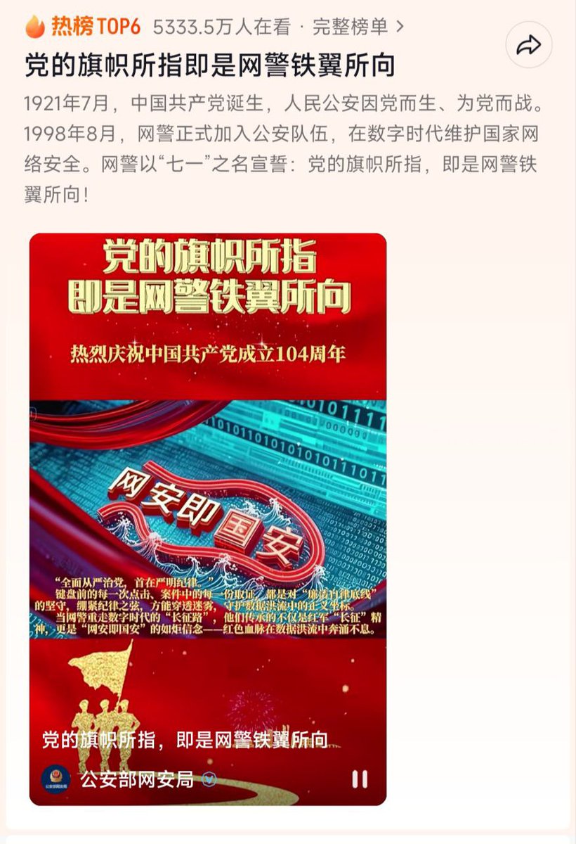 7月1日 网警在建党节表忠心,登上微博热搜。公安部网安局发文:党的旗帜所指,即是网警铁翼所向。
