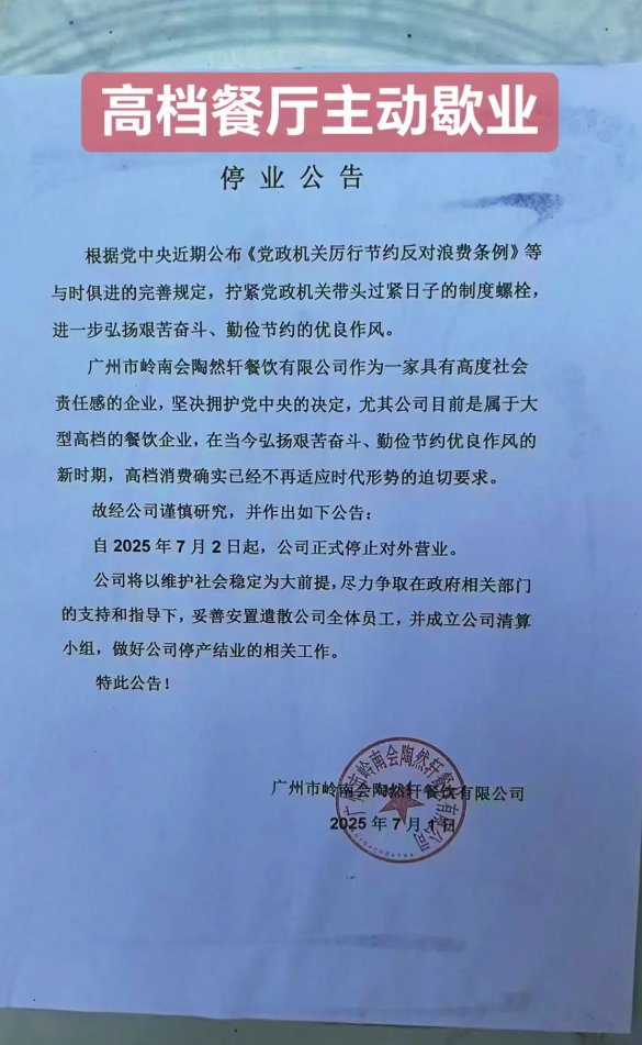 广州一餐饮公司发布停业公告疑似阴阳“禁酒令”7月1日,广州市岭南会陶然轩餐饮公司表示,作为高档餐饮企业,公司坚决拥护党中央关于《党政机关厉行节约反对浪费条例》的规定,决定从7月2日起停止营业,并成立清算小组,尽力争取妥善安置遣散全体员工。