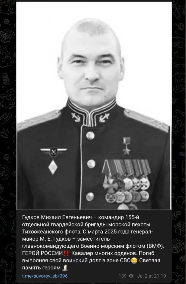 7月3日,据非官方的俄乌军事Telegram频道报道,俄罗斯海军副总司令米哈伊尔·古德科夫7月2日在库尔斯克州的战斗中被击毙。