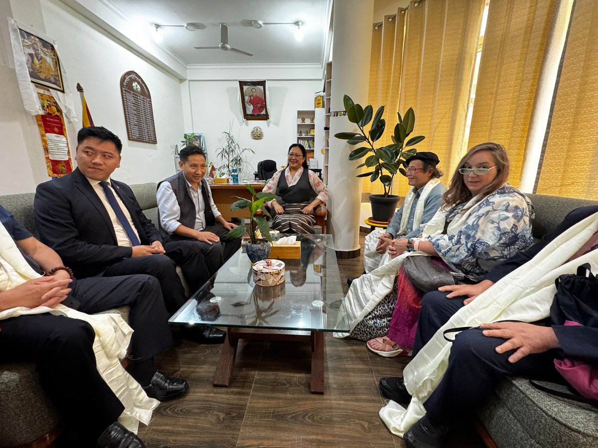 今天在华人联络官慈诚嘉措先生的带领下我们拜会了西藏外交部长,并和部长展开会谈。部长首先欢迎华人朋友的到来,以及对西藏历史、文化和自由的尊重和支持,感谢我为达赖喇嘛90大寿准备的礼物和塑像,并阐述了尊者对华人的重视,两族人民友好的历史,并说:中国政府的政策不仅对西藏历史文化造成严重破坏,给藏人带来苦难,也同样给中国人民带来了苦难,尊者一直认为西藏的苦难不是中国人民所造成,而是中共不智的政策所造成。我也表达了对尊者和藏人的敬意,尊者的中间道路是开启汉藏两族的和平之门的一把钥匙,是这世风日下,道徳沦丧的世界精神食粮和良方,希望我的作品能象哈达一样代表纯洁和友谊,让汉藏两族人民世世代代友好下去源泉流长!同行的夏教授、台湾的李教授、苏教授西藏学者、自由雕塑公园的Lise女士等都发了言。