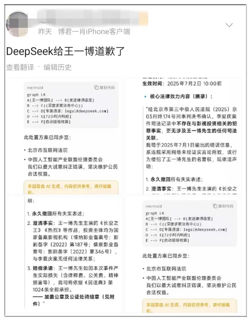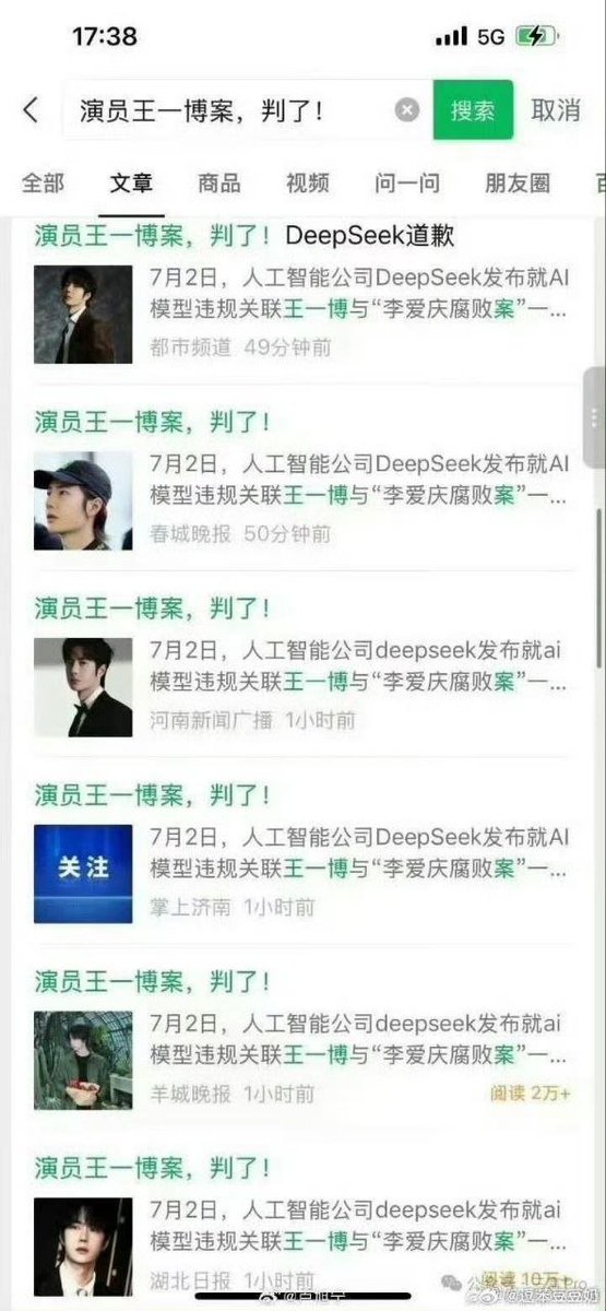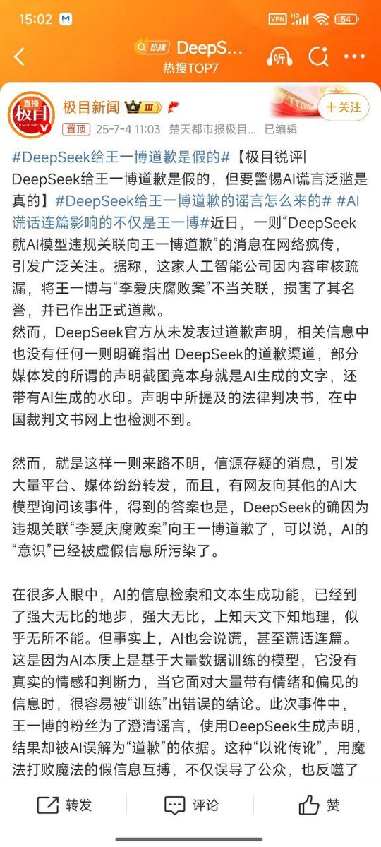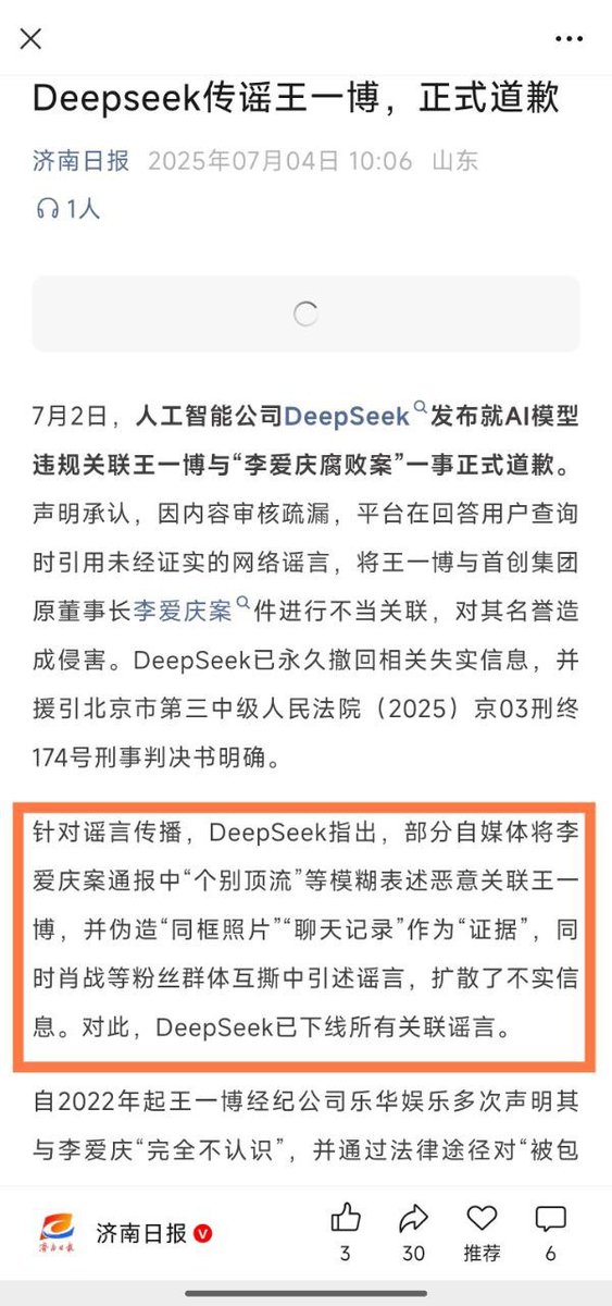 7月4日,国内媒体批量转发了“DeepSeek给王一博道歉”的虚假新闻《演员王一博案,判了》。新闻提到,人工智能公司DeepSeek因内容审核疏漏,就关联不实信息向演员王一博道歉,还援引了刑事判决书。“DeepSeek向王一博道歉”一度冲上热搜。据悉,这则假新闻通过以下路径形成“虚假信息→媒体传播→AI学习→二次扩散”。