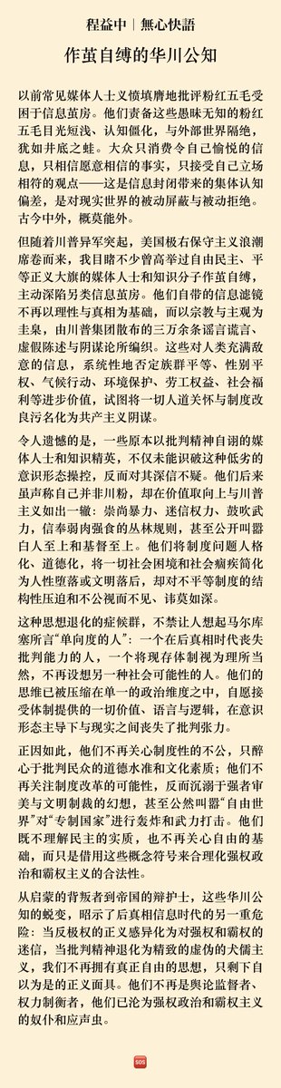 从启蒙的背叛者到帝国的辩护士,这些华川公知的蜕变,昭示了后真相时代的另一重危险:当反极权的正义感异化为对强权和霸权的迷信,当批判精神退化为精致的虚伪的犬儒主义,我们不再拥有自由的思想,只剩下正义的面具。他们不再是舆论监督者、权力制衡者,他们已沦为强权政治和霸权主义的奴仆和应声虫。