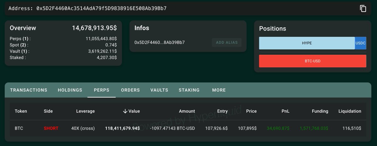 「2025.03 以来四次做空 $BTC 巨鲸」空单仓位再次突破 1 亿美元😎这位哥是真的牛,本轮做空已累计获利 1420 万美元,原本剩余仓位处于浮亏状态,在不断加仓的情况下也扭亏为盈了 —— 目前持仓 1097.47 BTC,开仓价格 $107,926.6,清仓价 $116,510,加上资金费用当前浮盈 160.5 万美元传送门 👉