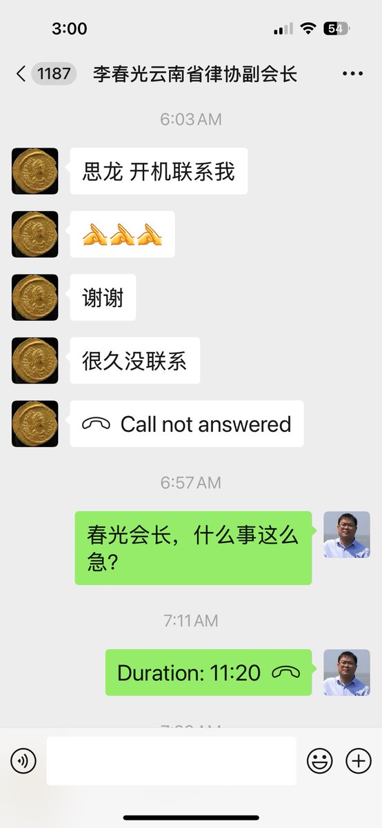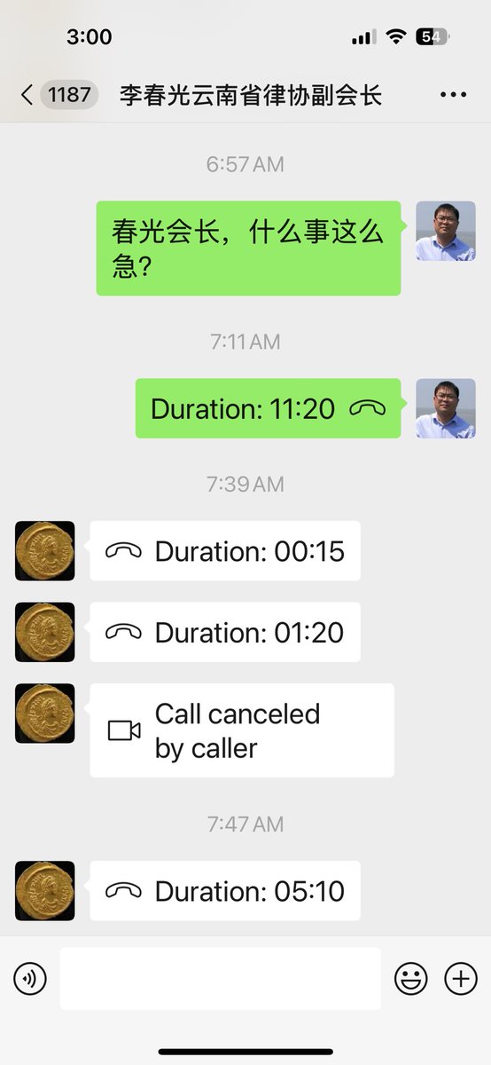 本人因参加7月5日在洛杉矶举办的中国律师纪念709大抓捕10周年会议,昨天昆明市司法局副局长胡昌坤等四人到温格律所调查本人的情况。今早刚开机,就接到云南省律协副会长李春光的微信电话,说10多个国保联系他,要以煽动颠覆国家政权罪抓捕我。说我是以卵击石,恐吓我不要参加反对中共独裁政权的活动。