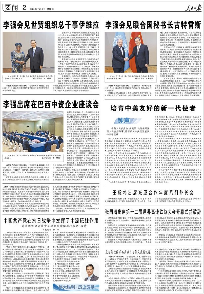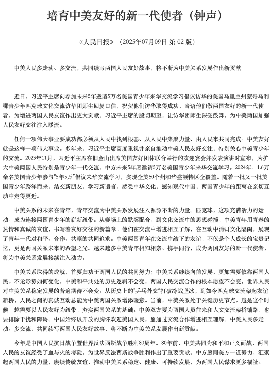 7月9日 人民日报第二页发表署名“钟声”的文章《培养中美友好的新一代使者》,其中写道“中美人民多走动、多交流,不断为中美关系发展作出新贡献”