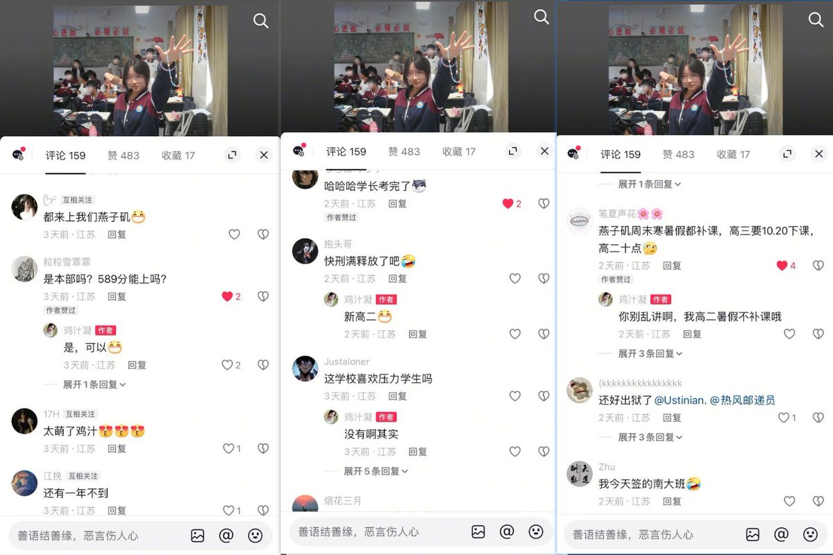 7月9日至11日,正值南京高中招生季,南京燕子矶中学的一名学生在抖音发布自拍,并配文调侃其学校为“燕子矶监狱”。该言论引发评论区关于学校作息时间的讨论,随后该学生便遭遇了来自校方与政府联合施压,被告知已“被市长关注”“全市都在盯着”,甚至还被威胁称将被网警封号。该学生表示并无诋毁学校之意,