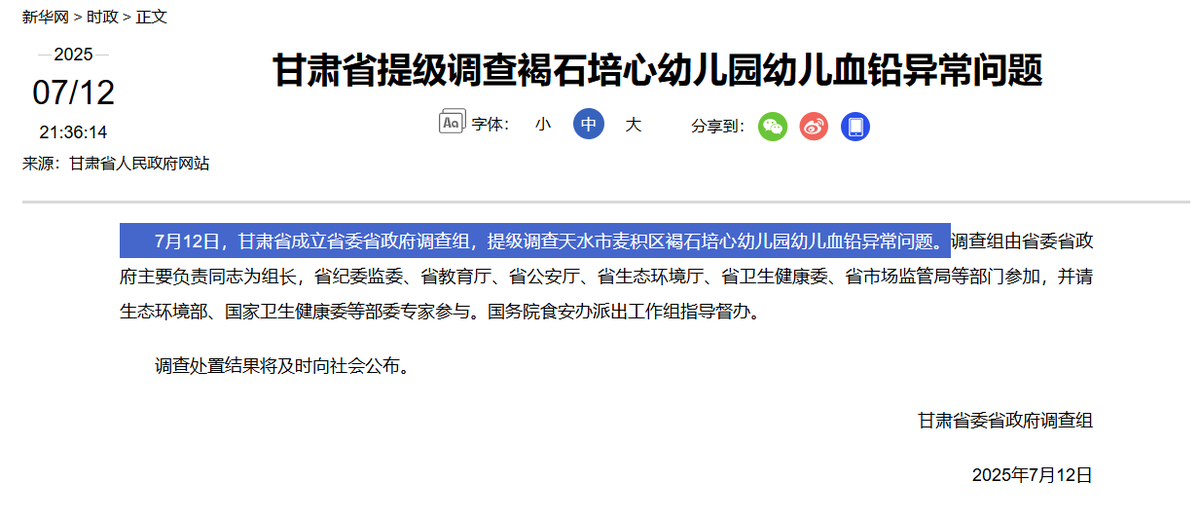 7月12日,官方宣布甘肃省成立省委省政府调查组,提级调查天水市麦积区褐石培心幼儿园幼儿血铅异常问题。目前,已有幼儿园园长、投资人、后厨等八人被刑事拘留。