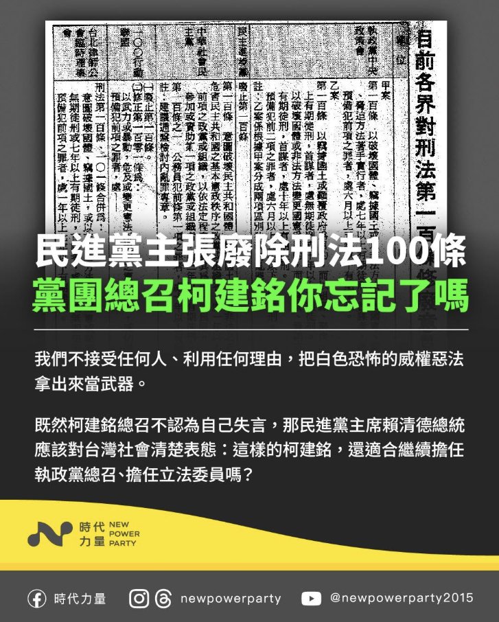近日,民进党立法院党团总召柯建铭再提《刑法》第100条,表示修法后的条文仍具约束力,警告蓝白立委涉嫌以暴力胁迫手段破坏宪政,甚至涉及叛国。