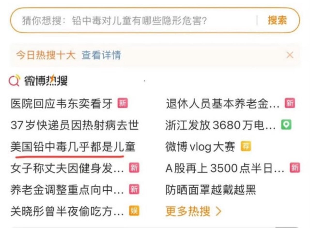 明明热议的是甘肃天水儿童铅中毒,热搜赶紧上架美国儿童铅中毒,忽然有人贴出美国当局对此赔偿了6亿多美元,热搜又匆匆下架了美国那档子事。不由得想起赵本山小品里的话:“你老弄个马甲配合我干啥玩意儿!”