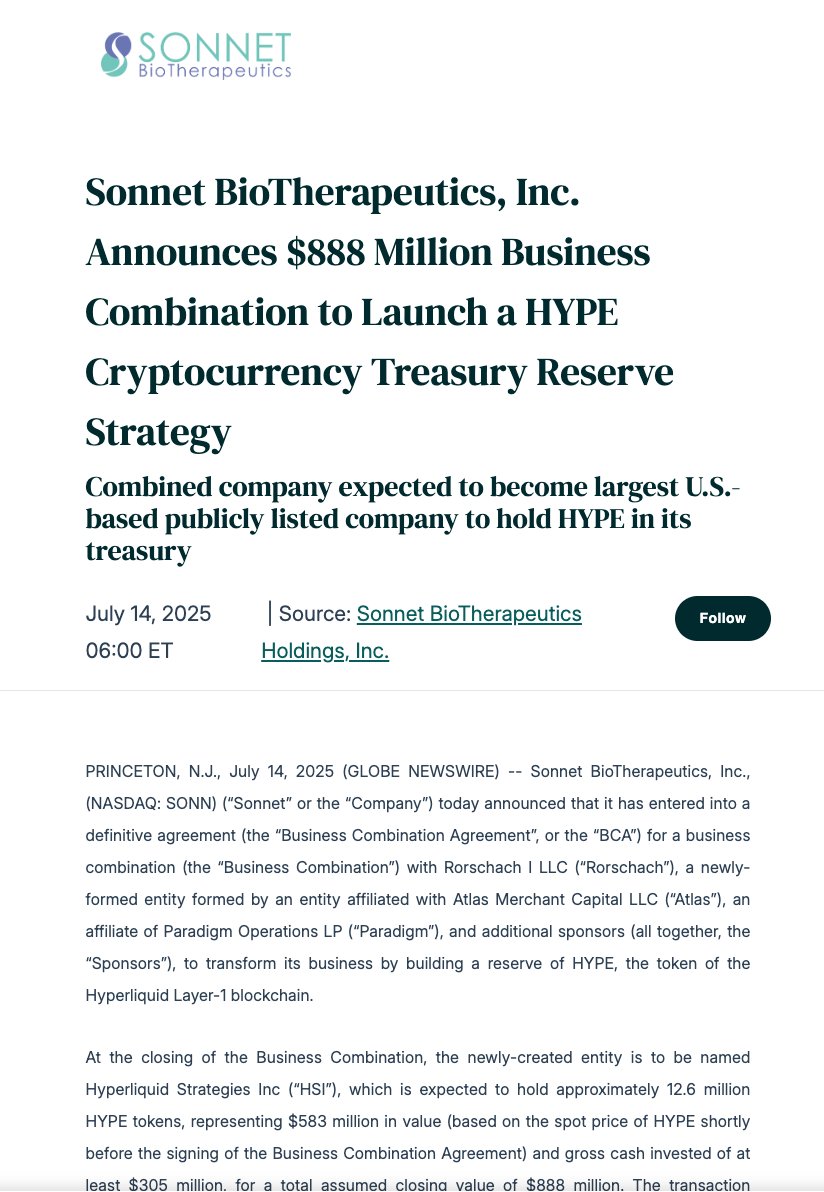 北京时间晚上6点上市公司Sonnet BioTherapeutics 宣布要搞8.88亿美金的 $HYPE 财库储备,他家股票 $SONN 从盘前5.17暴涨400% 至21.5,现在还有19。