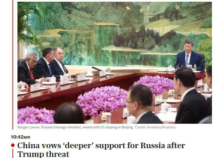在川普威脅對莫斯科的貿易夥伴徵收關稅後,中國誓言加強對俄羅斯的支持——《每日電訊報》習近平在北京會見俄羅斯外長後表示,兩國應「加強在多邊論壇上的相互支持」。中國外交部長表示,中國不能承受俄羅斯輸掉這場戰爭的後果,因為擔心華盛頓隨後會將注意力轉向北京。