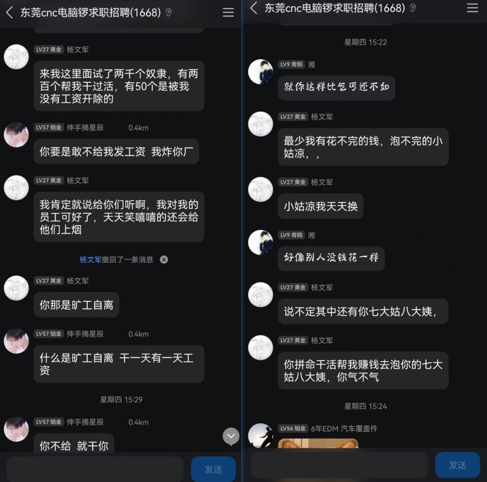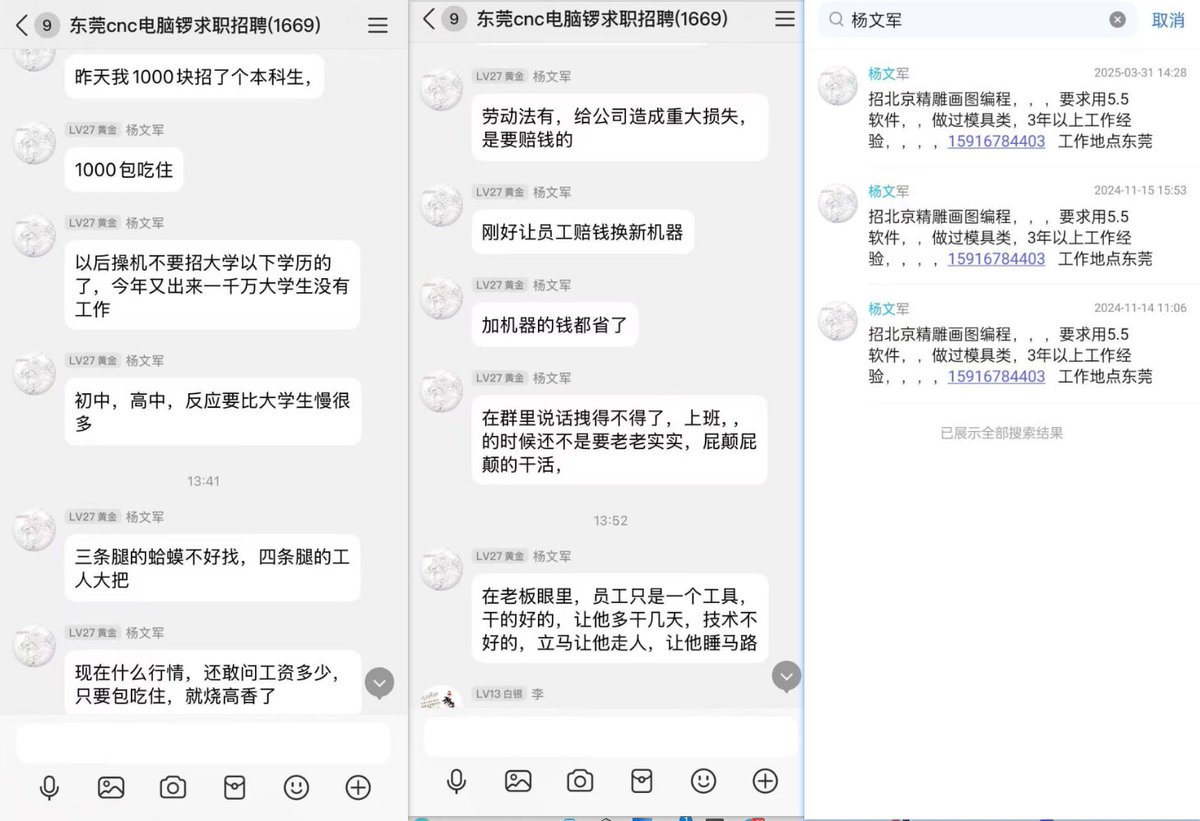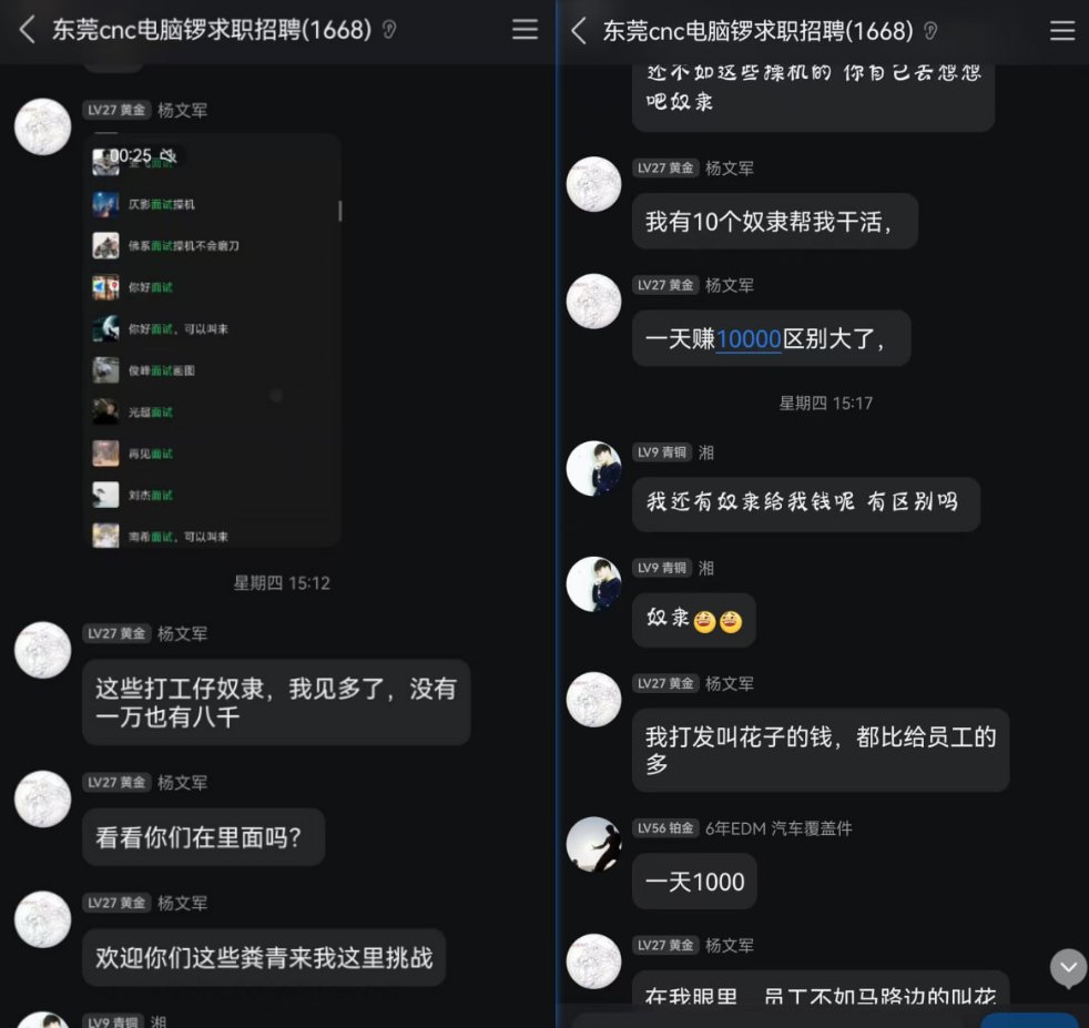 网友投稿广东东莞“汇鑫旺科技有限公司”老板杨文军堪比奴隶主,在招聘群里嘲笑员工都是奴隶,辱骂员工。他表示,“三条腿的蛤蟆不好找,四条腿的工人大把”,“给大学生1000块包吃住都不错了”,他还声称自己“打发叫花子的钱都比给员工的多”。