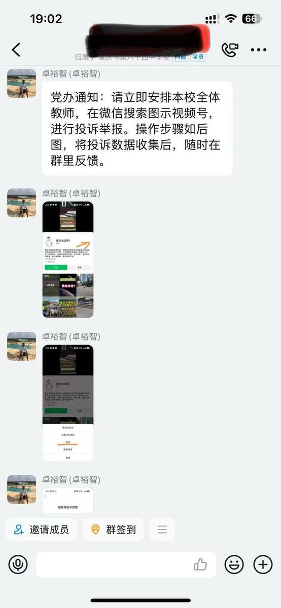 后续:家长的投诉视频在网上引起关注后,重庆市南岸区教委下达政治任务,要求所有老师们对相关微信视频号进行投诉举报,举报后还要截图打卡汇报。