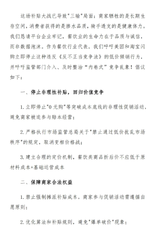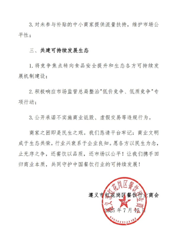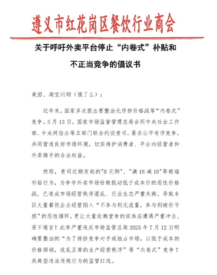 7月15日,遵义一餐饮商会发文倡议,呼吁外卖平台停止“内卷式”补贴和不正当竞争。文中表示,当前区域内商家已陷入两难:不参加则无流量,参加则破价亏损。外卖大战已经造成“三输”局面,商家牺牲长期生存空间,消费者获得掺水品质,骑手透支健康。餐饮业的生命力在于品质和诚信,而非数据泡沫。
