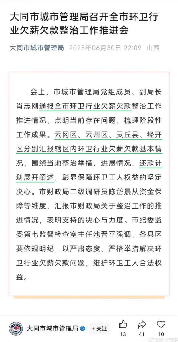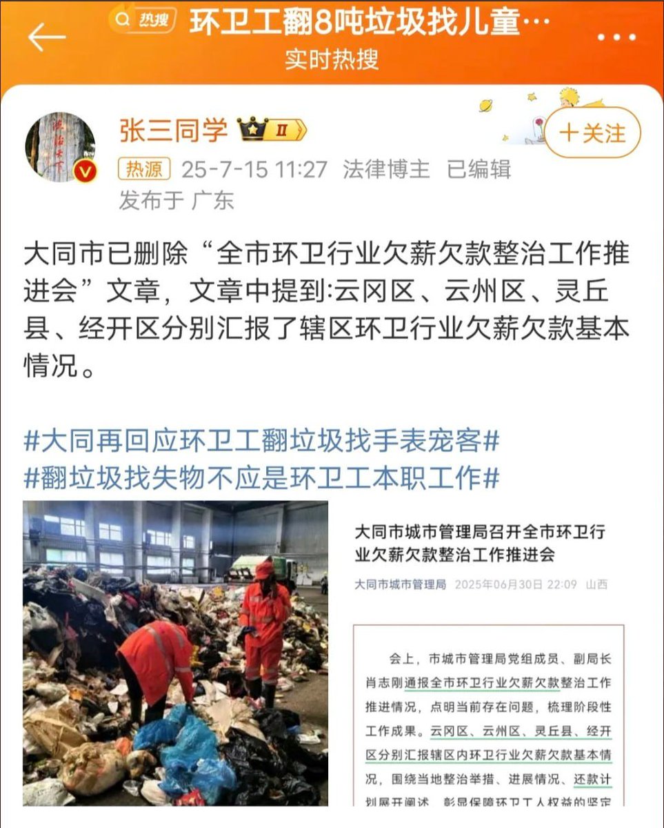 有网友发现,在大同环卫工人4小时翻8吨垃圾找儿童手表事件引发热议后,6月30日大同市城管局在微信公众号上发的《全市环卫行业欠薪欠款整治工作推进会》一文已被删除。这篇文章提到了“云冈区、云州区、灵丘县、经开区汇报了环卫行业欠薪欠款的基本情况。”