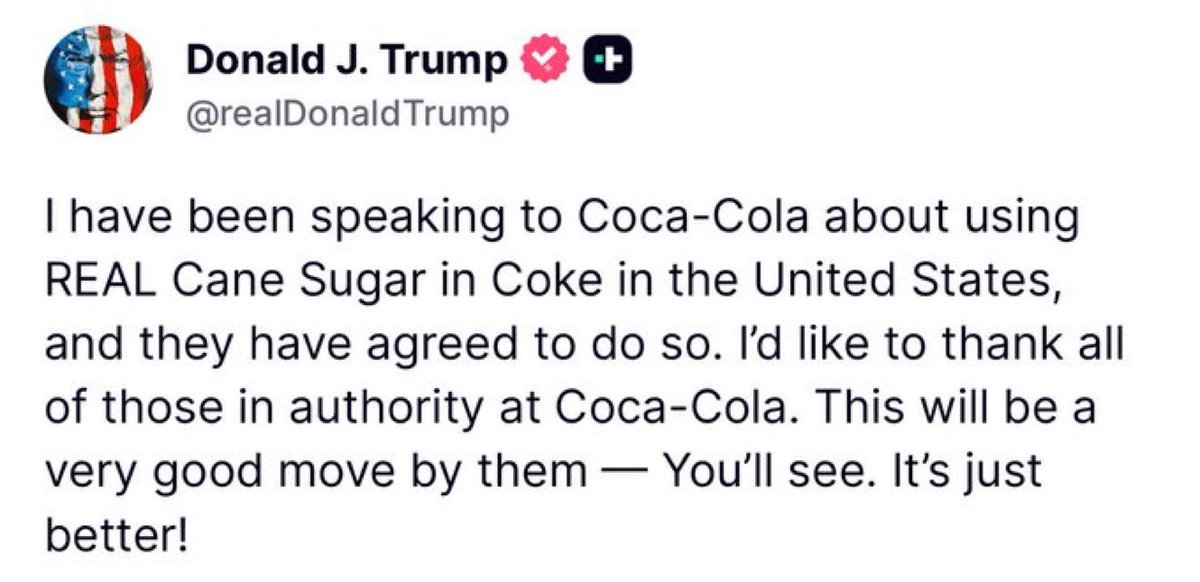 突发新闻:川普表示,可口可乐已同意在美国销售的产品中使用真正的蔗糖