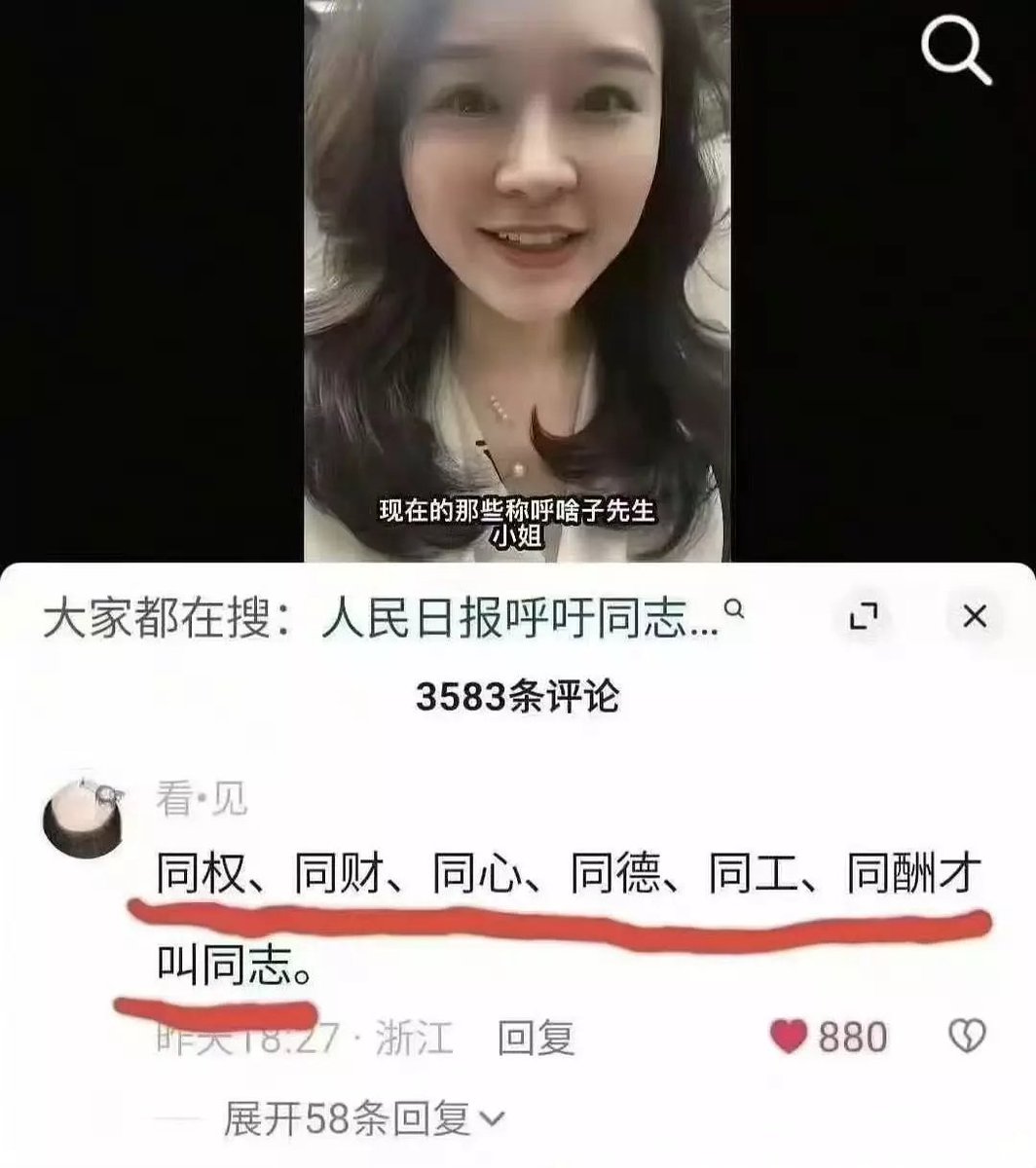 此前,人民日报呼吁将“同志”这个称号回归主流。对这一呼吁,有网友如此回应: