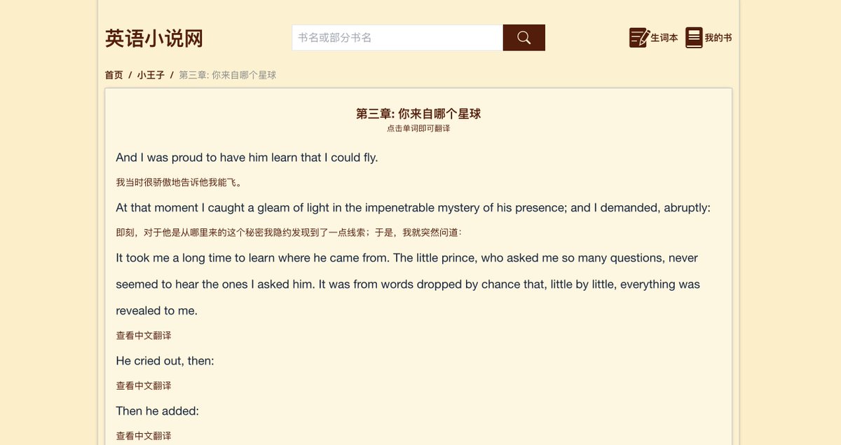 一个专门免费提供英语小说阅读的网站,界面干干静静,网站最大的特色是提供双语对照阅读模式。我很喜欢这种模式,先尝试理解英文原文,遇到困难时再去参考中文翻译,很方便。而且每本书都贴心的标注了适合的读者水平(如高中,初中,大学),点击单词即可跳出对应翻译和发音,很细。链接扔评论区了