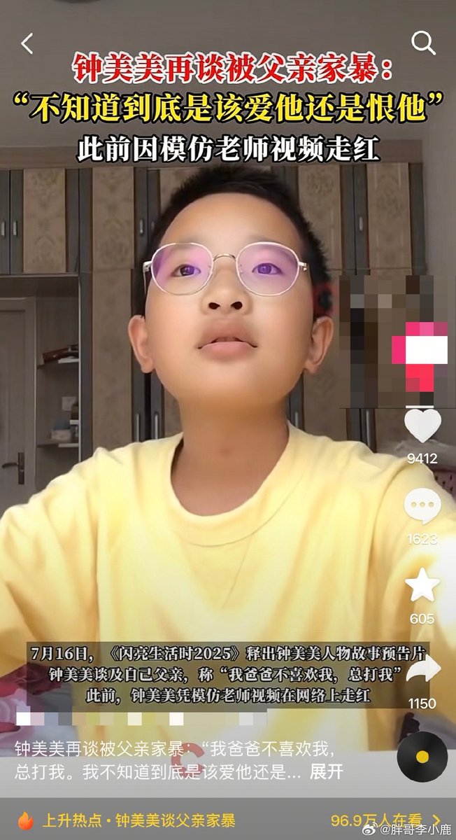 此前因模仿老师特别像而走红的小孩“钟美美”说,自己长期被父亲家暴。对此,温良的网友们表示:要是我,我打得更狠。