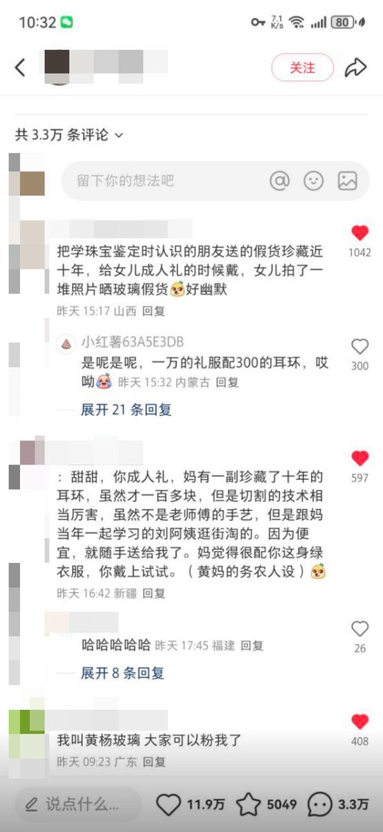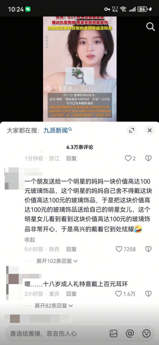 在官方通报称黄杨钿甜的耳环是玻璃仿品后,众多网友表示难以置信。有网友质疑:一个送给明星妈妈,给她女儿当作18岁成人礼物,并且被她女儿天天戴在耳朵上炫耀的耳环竟然只值100块。网友也纷纷在评论区留言讽刺。