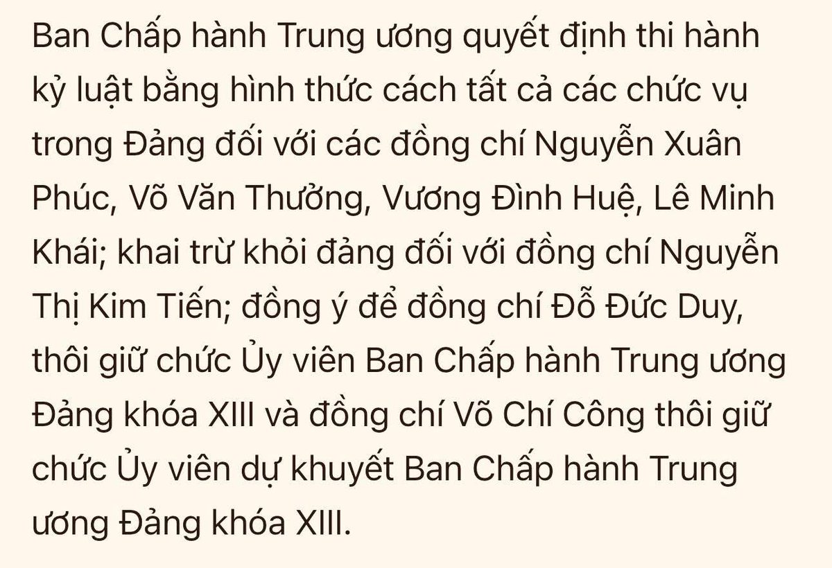 This is pretty shocking: former PM Nguyen Xuan Phuc, former President Vo Van Thuong, former NA Chairman Vuong Dinh Hue &former DPM Le Minh Khai have been stripped of all positions in the Communist Party. Former health minister Nguyen T Kim Tien’s also been expelled from the Party