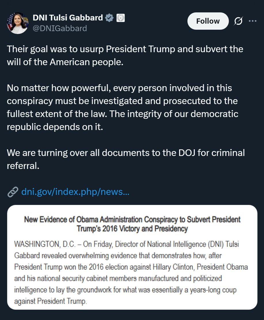 🚨重磅消息:美国国家情报总监图尔西·加巴德呼吁起诉巴拉克·奥巴马、詹姆斯·科米、约翰·布伦南和詹姆斯·克拉珀,理由是他们捏造了“通俄门”骗局背后的情报🔥她刚刚公开了一批文件——并已将其移交司法部,作为刑事移送材料👍