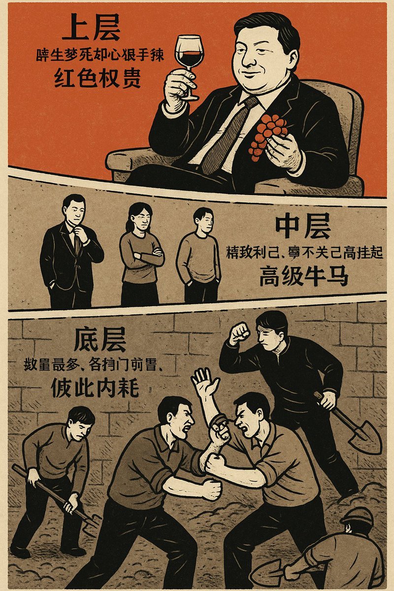 中共国的现实结构:上层是醉生梦死却心狠手辣、擅长精神PUA的红色权贵;中层是精致利己、事不关己高高挂起的高级牛马;底层是数量最多却各扫门前雪、彼此内耗的低端牛马。前两者最爱说的一句话是:“你过得不好,不就是你不够努力?国家给你那么大平台,不争气怪谁?”