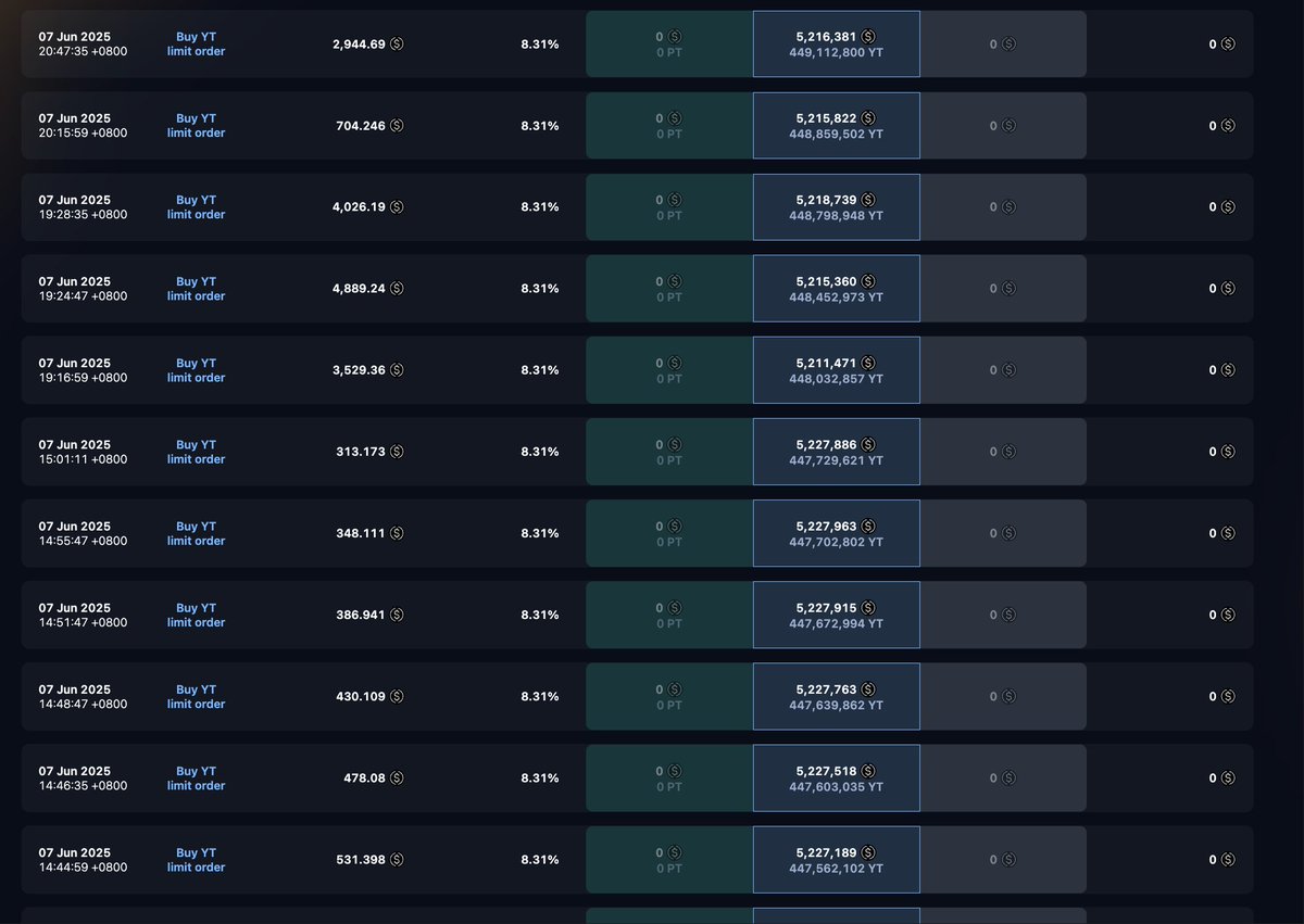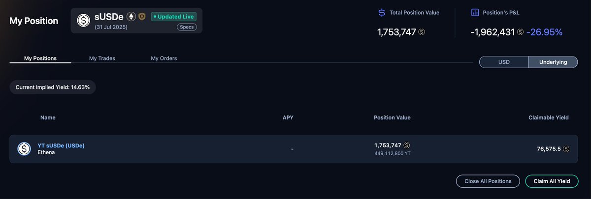 胜利属于信仰者啊 —— 低点梭哈 500 万买 YT,Ethena Season4 空投价值超 1067 万美元!😆Ethena 积分排行榜 TOP1 巨鲸在 05.21 - 06.03 $ENA 币价下跌期间($0.37 > $0.28) 买入近 4.5 亿枚 07.31 到期的 sUSDe YT(约 500 万美元),根据当前 sUSDe APY 9.74% 估算一天能产生 12 万美元的利息收益!