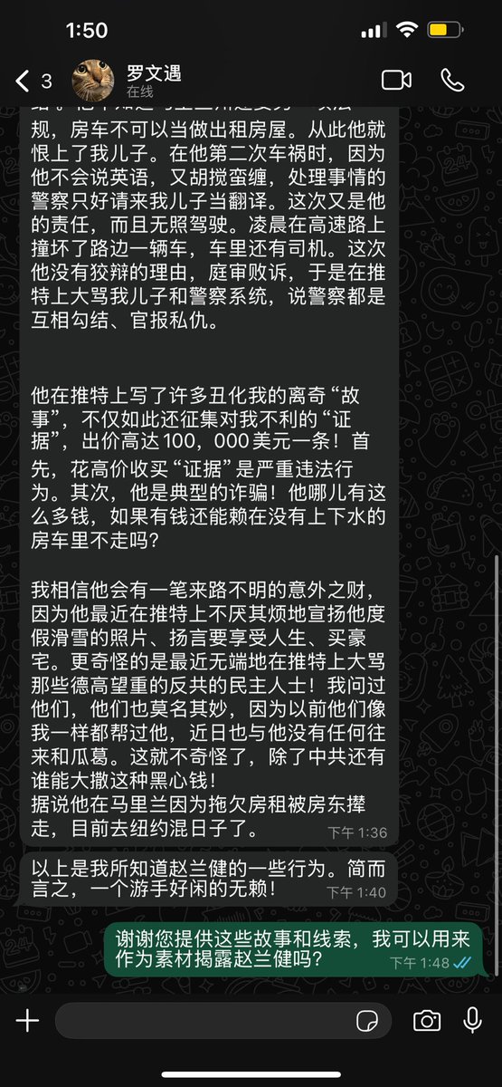 赵兰健因拖欠房租被房东驱逐,现流窜至纽约。他在社交媒体上炫耀度假滑雪、扬言买豪宅,攻击反共民主人士。这种经济状况的矛盾,暗示可能有不明资金来源,符合遇罗文老师的猜测:可能受外部势力(如中共)资助,动机或涉及政治利益。