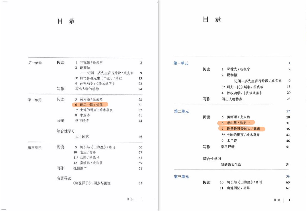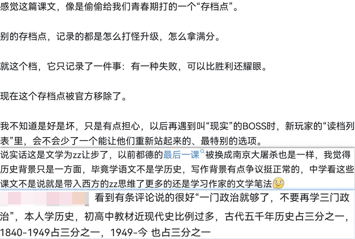 近日,有网友发现,2024年新修订的部编版七年级下册的语文课本里,删除了茨威格《人类群星闪耀时》一书中讲南极探险的《伟大的悲剧》一文,而改成了《“蛟龙”探海》。法国作家都德的《最后一课》也被换成了歌颂朝鲜战争的《谁是最可爱的人》和歌颂长征的《老山界》。 很多网友表达了对这些当年启迪了自己青春的作品的不舍,认为文学和美不应该为政治让位。还有网友评论说:“学一门政治就够了,不要再学三门政治了”。