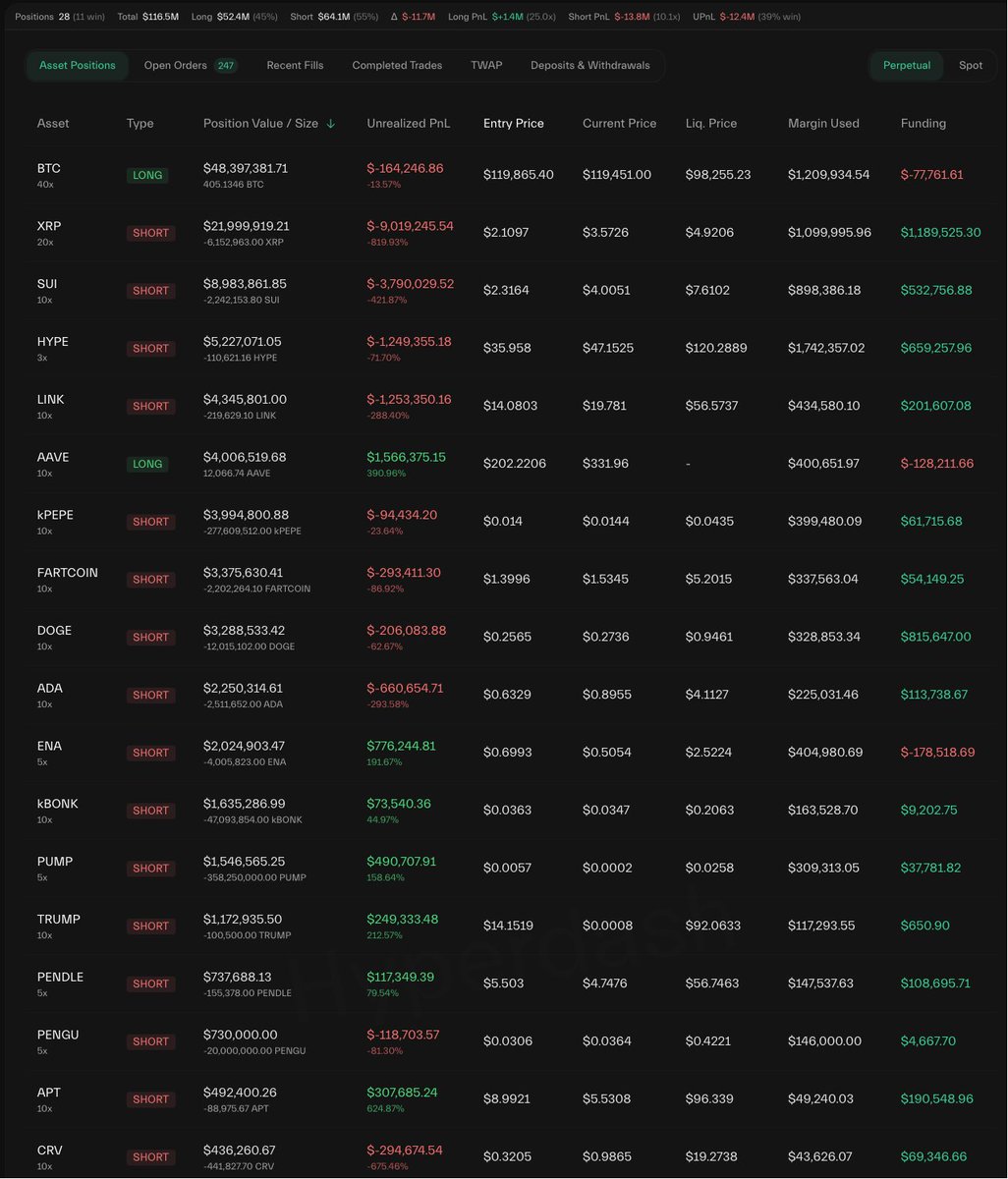 今年五月之前「做空」就是版本密码,但只要撞上一次类似近期的猛烈拉升,就会迅速回吐利润;很明显这位聪明钱执行了「高市值大仓位,小市值小仓位」的做空打法,只有 BTC / AAVE 是做多的,其他共计做空的 26 个仓位中只有 38% 是浮盈状态,累计浮亏 1248 万美元,仅 XRP 单币亏损就高达 900 万美元