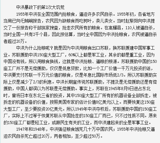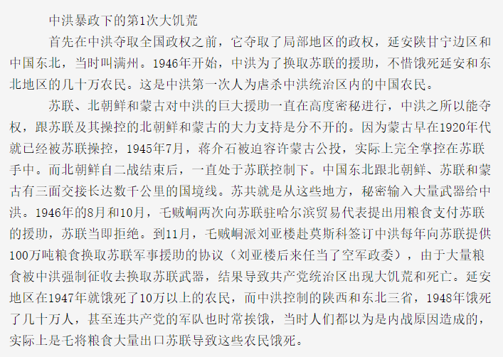 朱忠康:中共暴政下发生过3次大饥荒,第1次发生在1946-48年的“解放区”;49年后又发生过2次,60年前后的所谓“三年大饥荒”是第3次,也是世界史上第1大的大饥荒;世界史上的第2大的大饥荒也发生在中国,在1887-1888年中国北方饿死了1000万人。世界历史上第3大的大饥荒是32-34年,苏联饿死600万人。