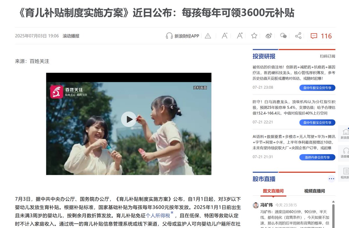 根据中共发布的《育儿补贴制度实施方案》显示中共将对3岁以下的孩子,提供生育补贴,补贴金额为3600元/年早先彭博社的报道提前透露了该激励措施